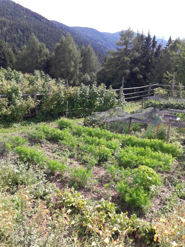 Ein Blick in den Gemüsegarten vom Fichtenhof bei Salurn, Südtirol, mit improvisierter Bewässerungsanlage. So etwas könnten wir in der Eifel auch gebrauchen…