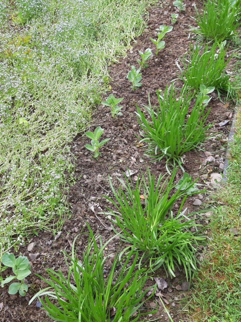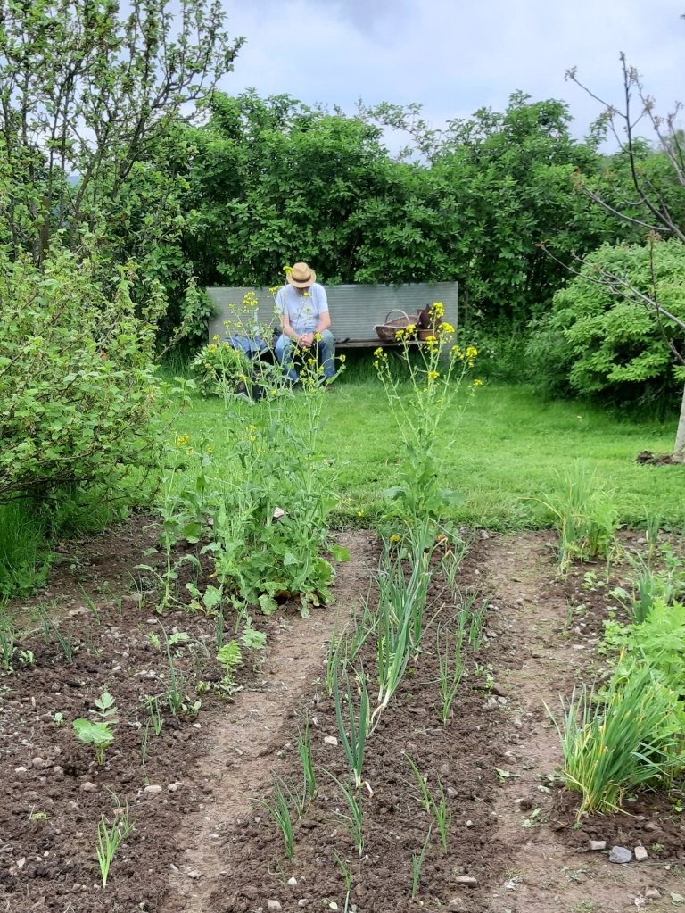 Das kleine Zwiebelbeet ist wieder freigelegt. Rechts wuchert Knoblauch, überall haben sich Pastinaken ausgesät und das Mairübchen blüht auch schon. Die Zwiebelchen brauchen also unsere Unterstützung.