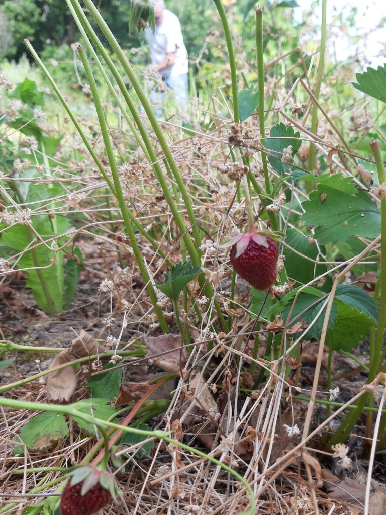Erdbeeren sind sehr robust. Sie wachsen eigentlich überall. Schnecken sind auch sehr robust. Aber sie mögen es nicht trocken… das Rapünzelchen war ebenfalls sehr wüchsig, nur ein paar Monate früher. Jetzt ist es vertrocknet, verteilt seine Samen für den kommenden Winter und wir freuen uns über diese unverhoffte Hilfe: denn das „Stroh“ stützt die Früchte und schützt vor den Schnecken.