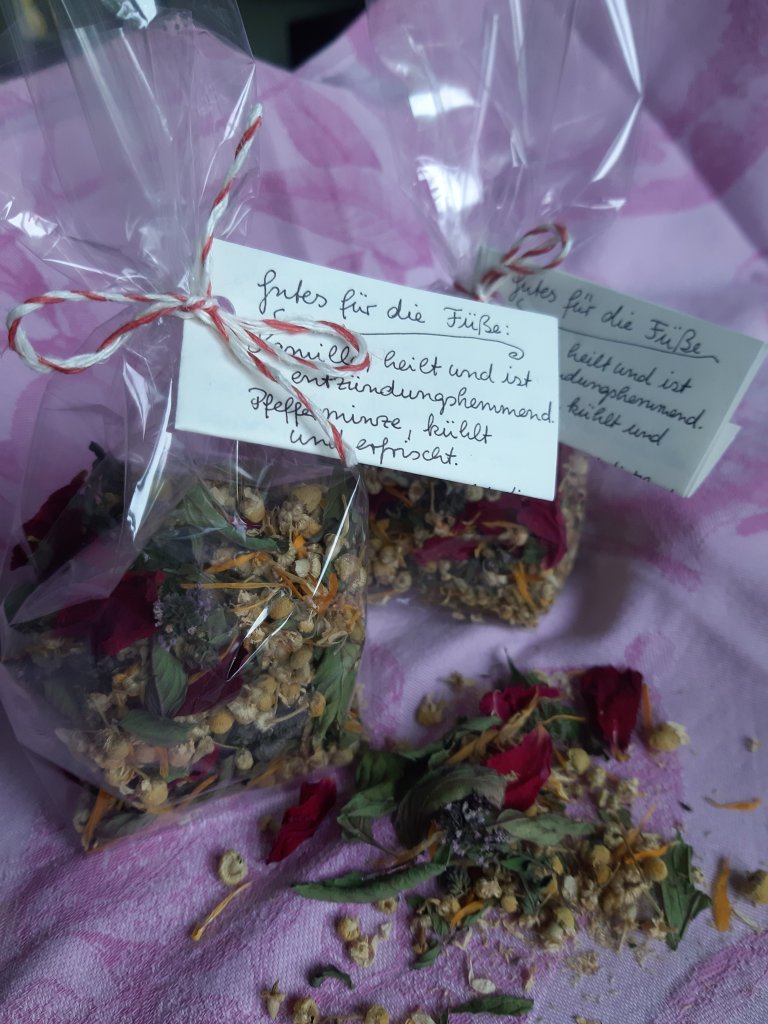 Seit einiger Zeit sammele ich schöne Blüten zum Trocknen. Jetzt habe ich einige für ein sommerliches Fußbad zusammengestellt.