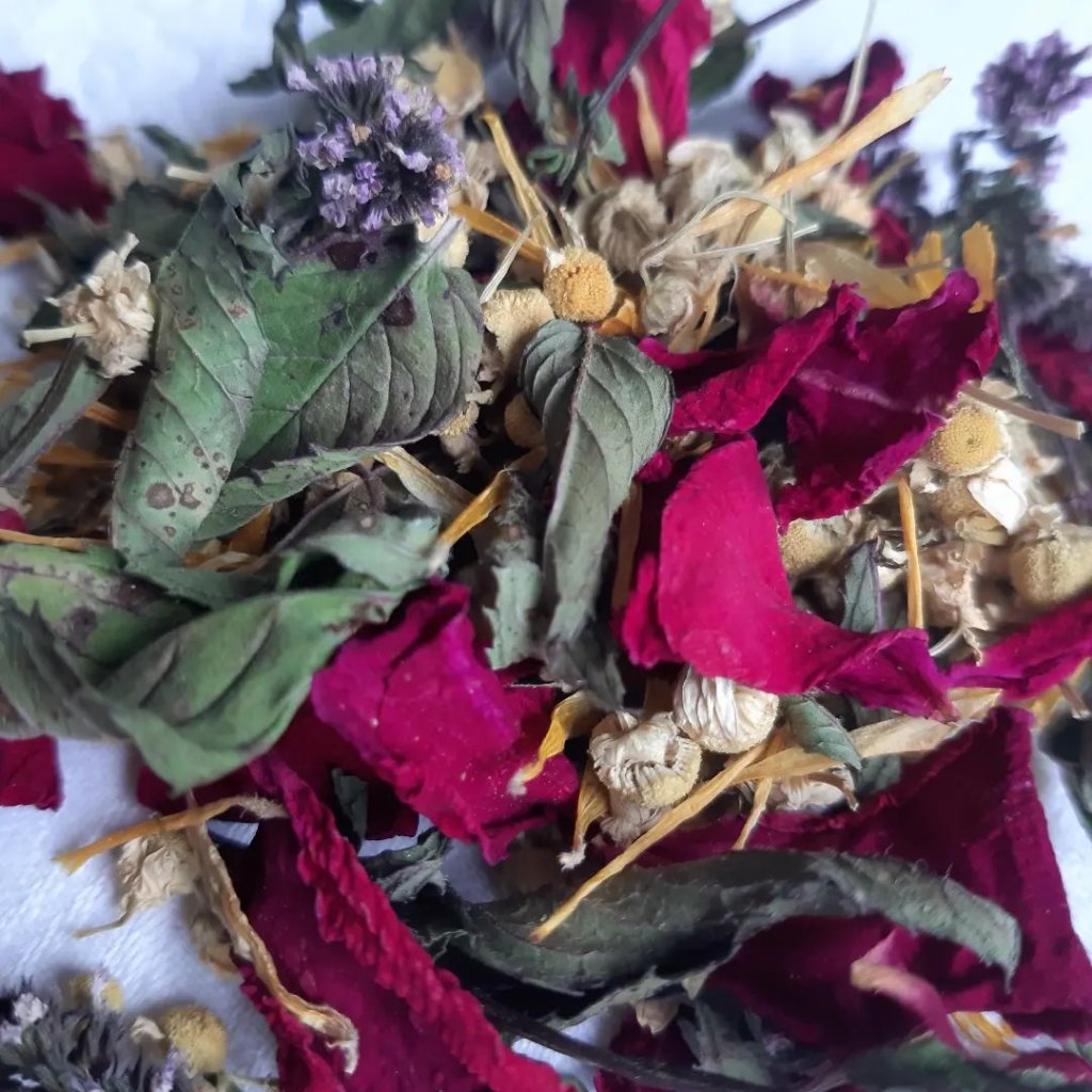 Kamille, sie heilt und ist entzündungshemmend. Pfefferminze kühlt und erfrischt. Die Ringelblume macht die Haut widerstandsfähig und Rosenblüten entspannen. Ein Artikel in der LandLust hatte mich auf diese Idee gebracht.