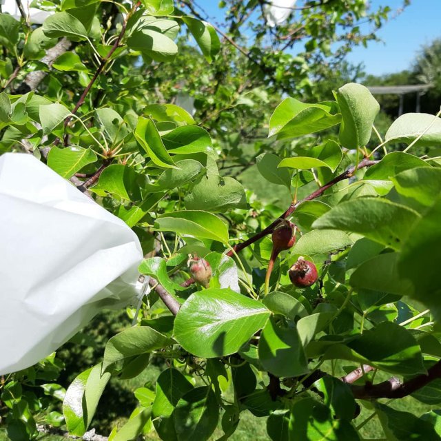 Der Sommer 2020 soll wieder trocken werden. Also kann sich diese Maßnahme lohnen: die kleinen Früchte der Williams Christbirne kommen in Pergamenttütchen. So sind sie vor den gierigen Staren geschützt und wachsen auch bestens… in diesem Mikroklima! Ob wir es nächstes Jahr mal mit Gläsern versuchen sollten?