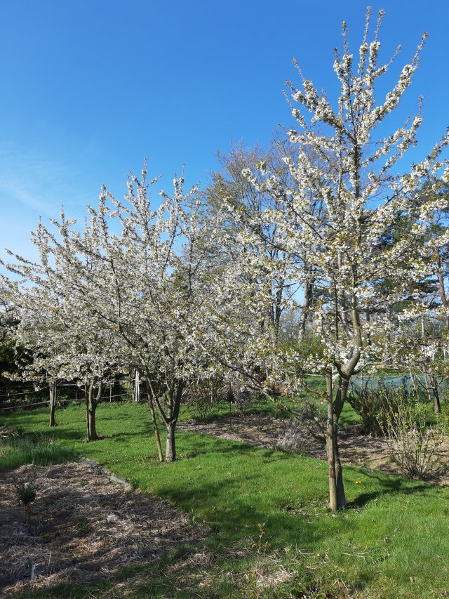 Deutlich vor den Eisheiligen haben unsere inzwischen sehr stattlichen Süßkirschen geblüht. Die Eisheiligen war sanft und so erwarten wir eine gute Ernte – wie im vergangenen Jahr! Da konnten wir zum ersten Mal ernten ohne Ende. Fantastisch!
