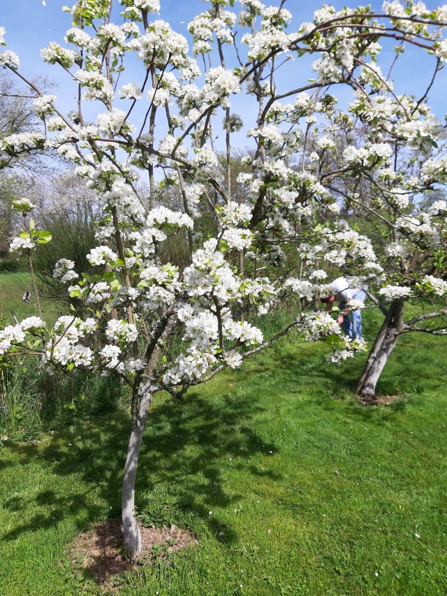 Der Frühling 2023 ist endlich angekommen. Anfang Mai blühen die Williams Christbirnen in wunderschönen weißen Büscheln. Die Apfelbäume sind noch nicht soweit.